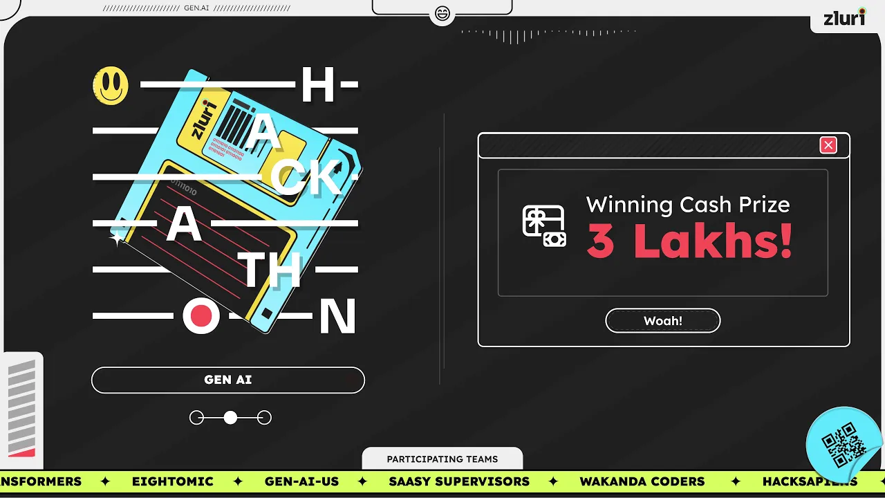 Visually, the loop was designed to be both lively and non-intrusive, cycling every 2 minutes. A ticker format showcased each team’s name at the screen’s base, building a sense of collective momentum. Pops of color, animated "hackathon" typography, and occasional UI-inspired overlays echoed the creativity of the event itself. The result: a visual anchor that energized the room, celebrated Zluri’s people, and underscored GenAI’s transformative potential—all while letting the hackathon action take center stage.